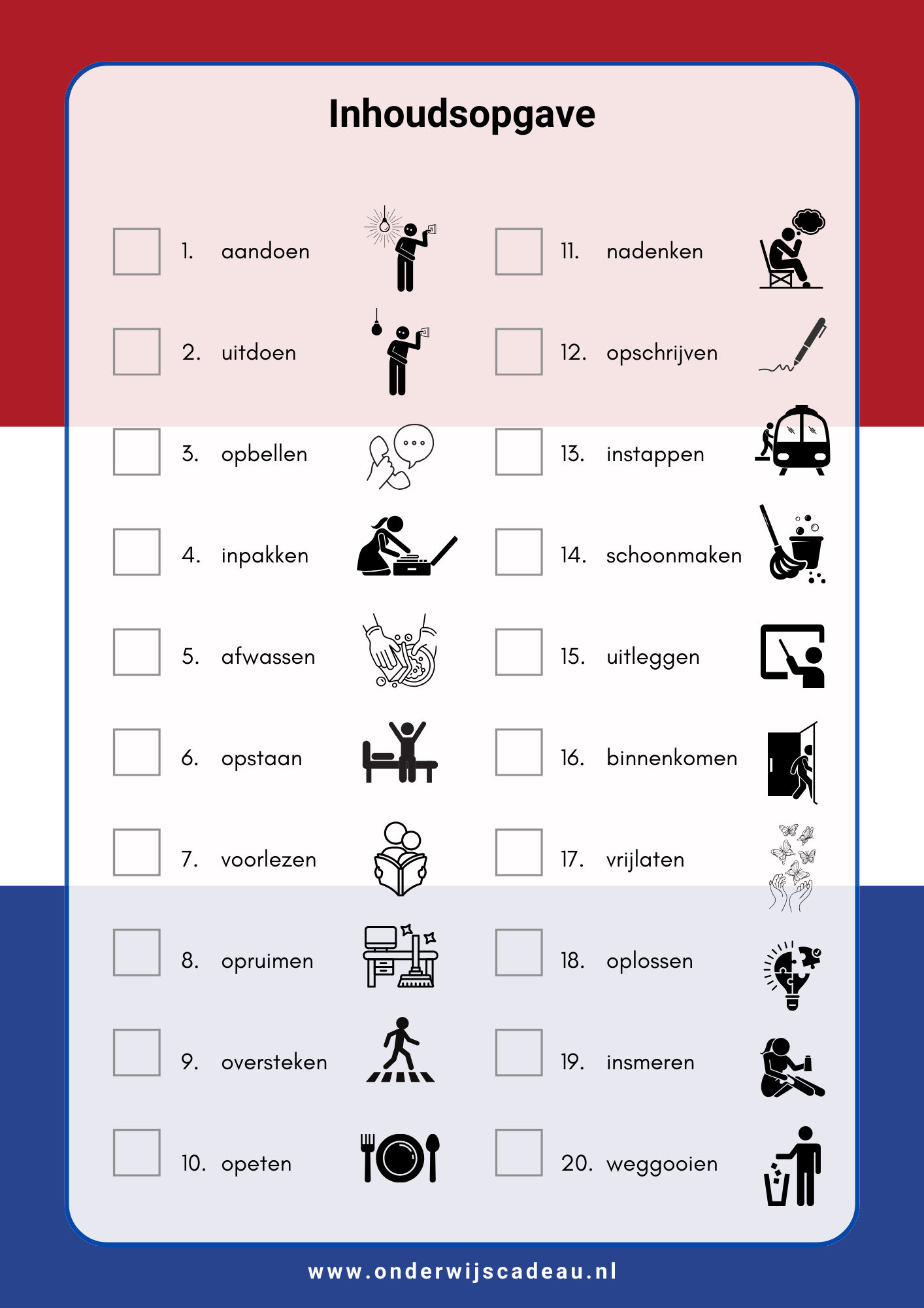 Het pakket bevat 20 lessen, die bedoeld zijn voor NT2-leerlingen in het basisonderwijs. Elke les heeft dezelfde opbouw, waardoor leerlingen snel zelfstandig kunnen werken. Werkwoorden leren vraagt om veel oefening. Herhaling van de lessen raden we daarom zeker aan.