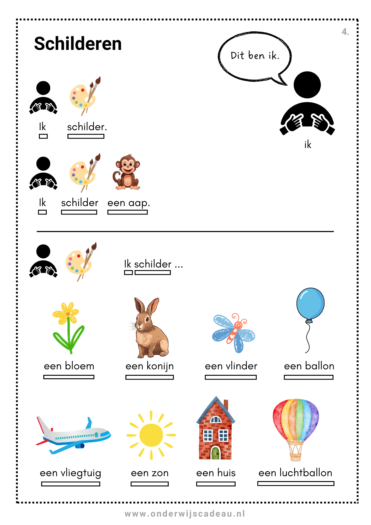 De werkbladen zijn steeds op dezelfde manier opgebouwd en elke zin wordt volledig ondersteund door plaatjes. Onder de zinnen staan witte balkjes. Deze kunnen eventueel ingekleurd worden om de zinsopbouw te verduidelijken.