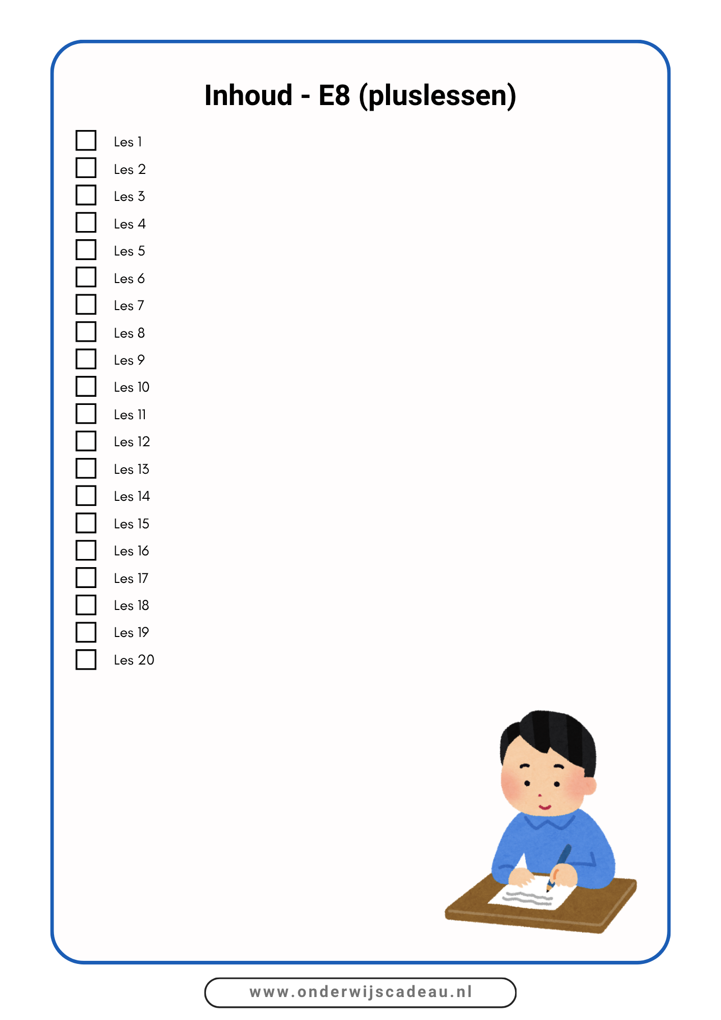 - Het pakket bevat 20 lessen om te oefenen met de verschillende categorieën op E8-niveau.