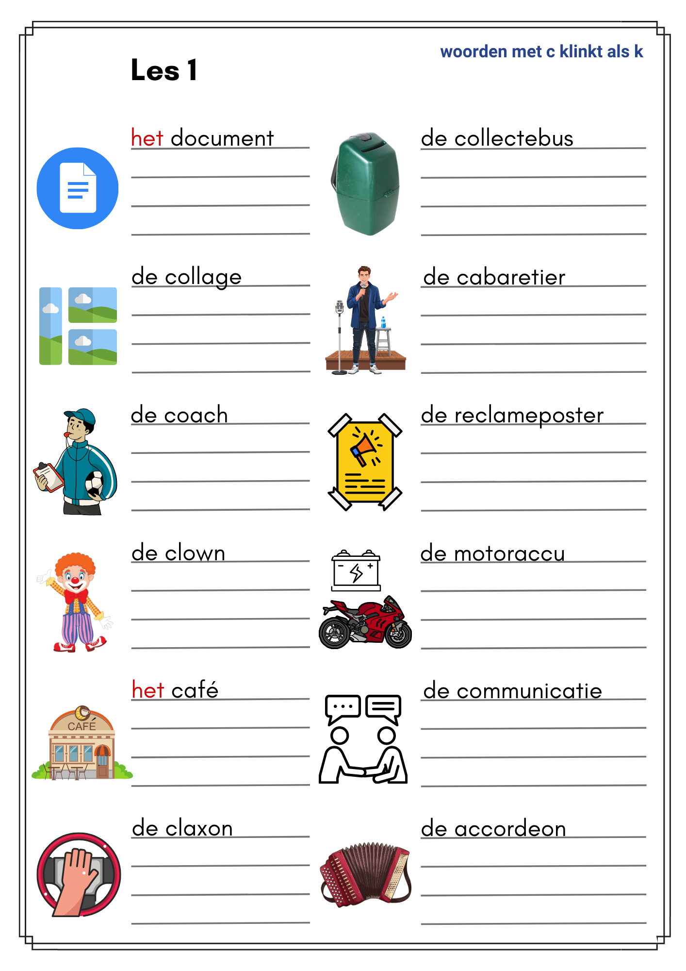 Alle lessen hebben dezelfde opbouw en worden visueel ondersteund. De leerlingen schrijven elk woord drie keer op. We hebben ervoor gekozen om geen regels bij de categorieën te zetten. Daardoor is dit lespakket een perfecte aanvulling op elke methode. In deze speciale NT2-versie hebben we het lidwoord 'het' rood gemaakt.