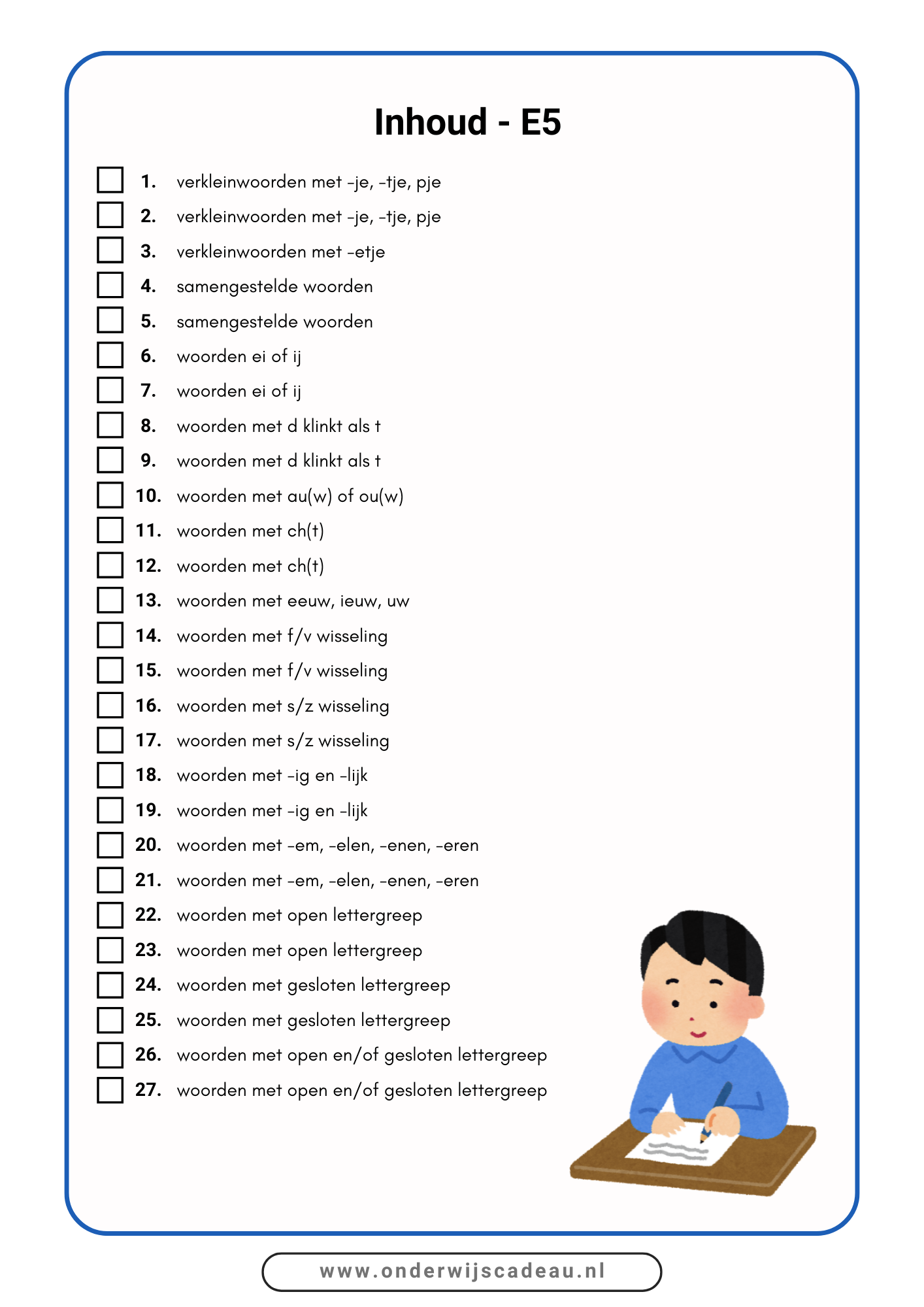 - Het pakket bevat 27 lessen om te oefenen met de verschillende categorieën op E5-niveau.