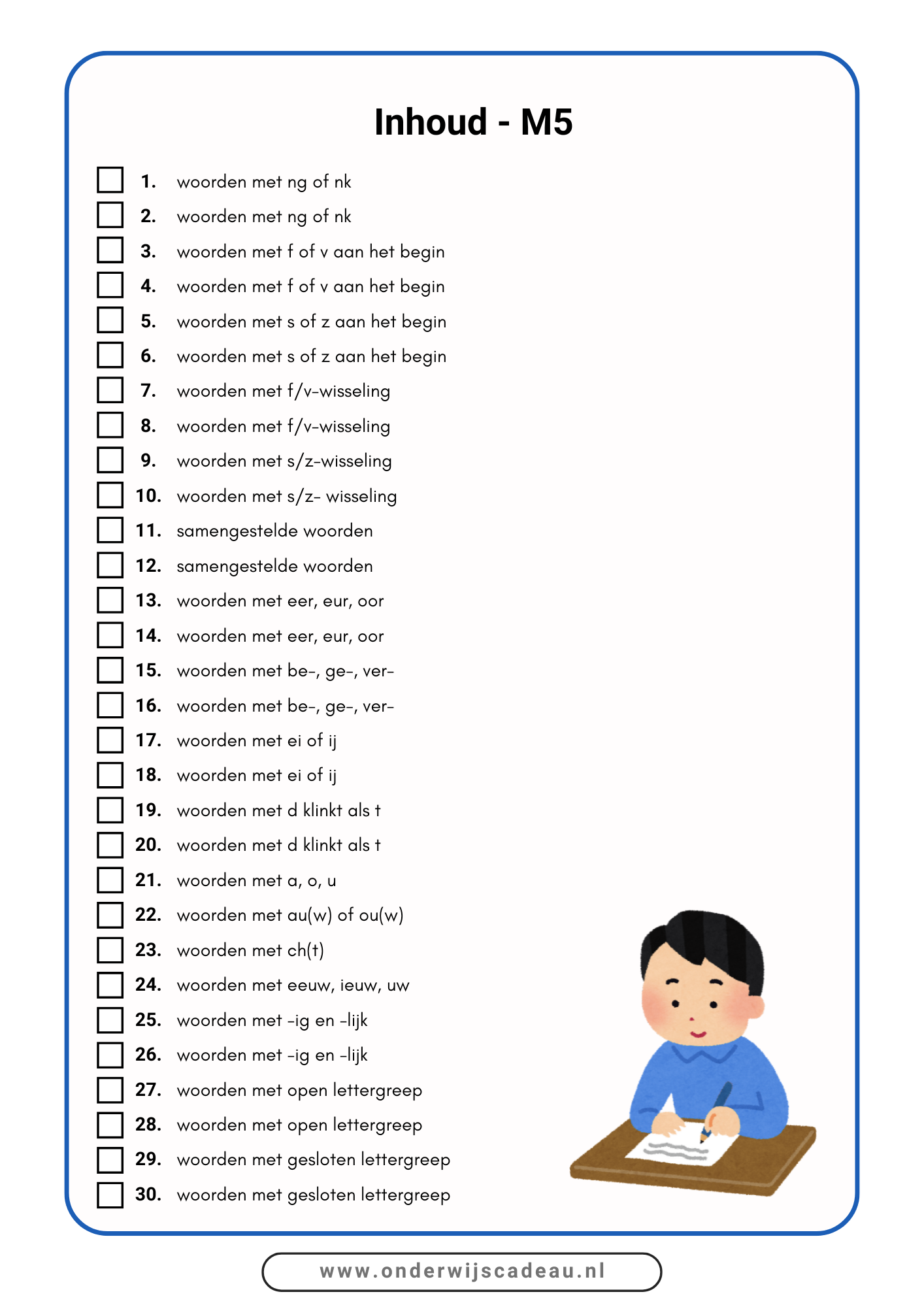 - Het pakket bevat 30 lessen om te oefenen met de verschillende categorieën op M5-niveau.